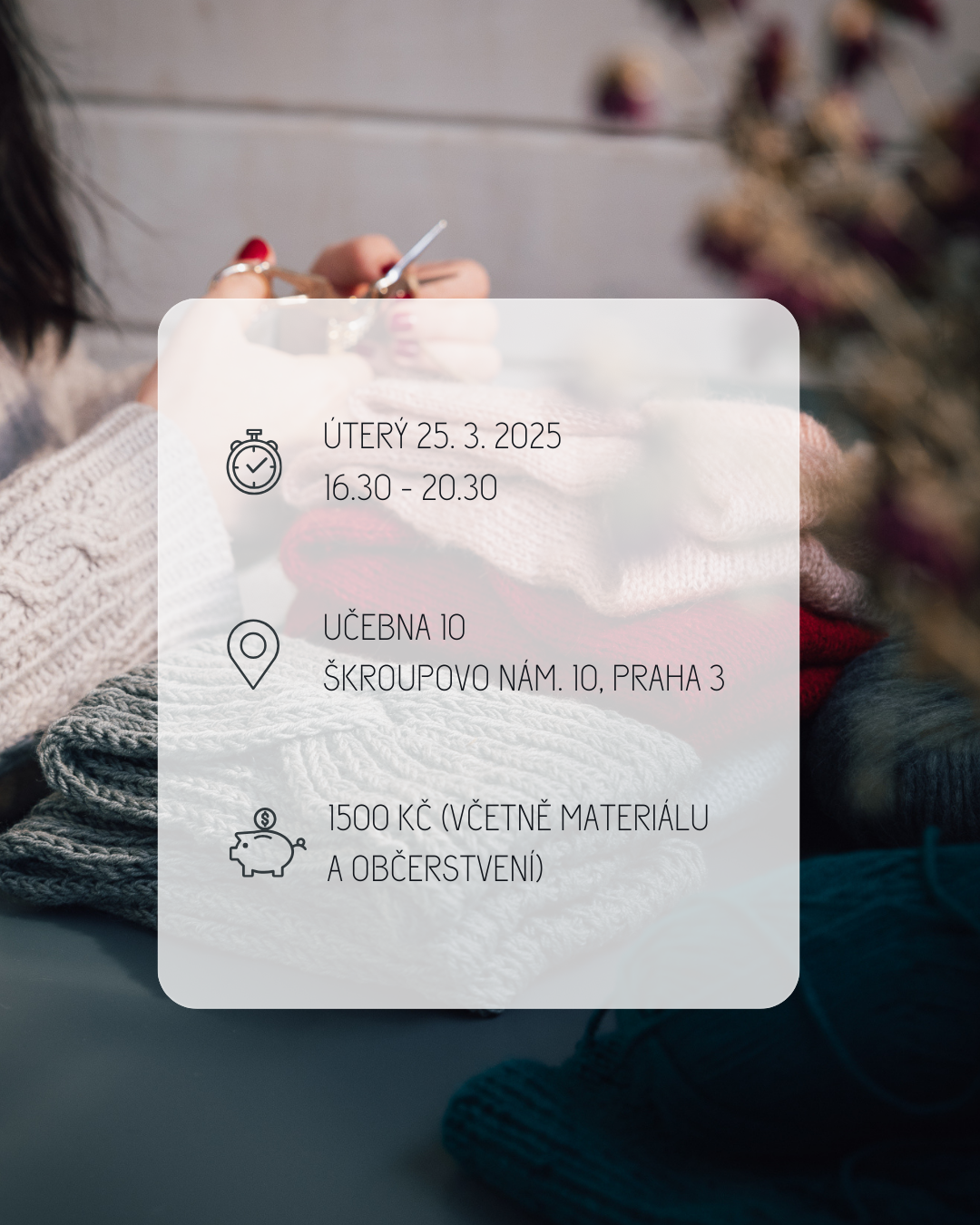 V ceně workshopu jsou příze i jehlice, které vám už zůstanou, a drobné občerstvení a teplé nápoje, abychom si březnové odpoledne společně užili.